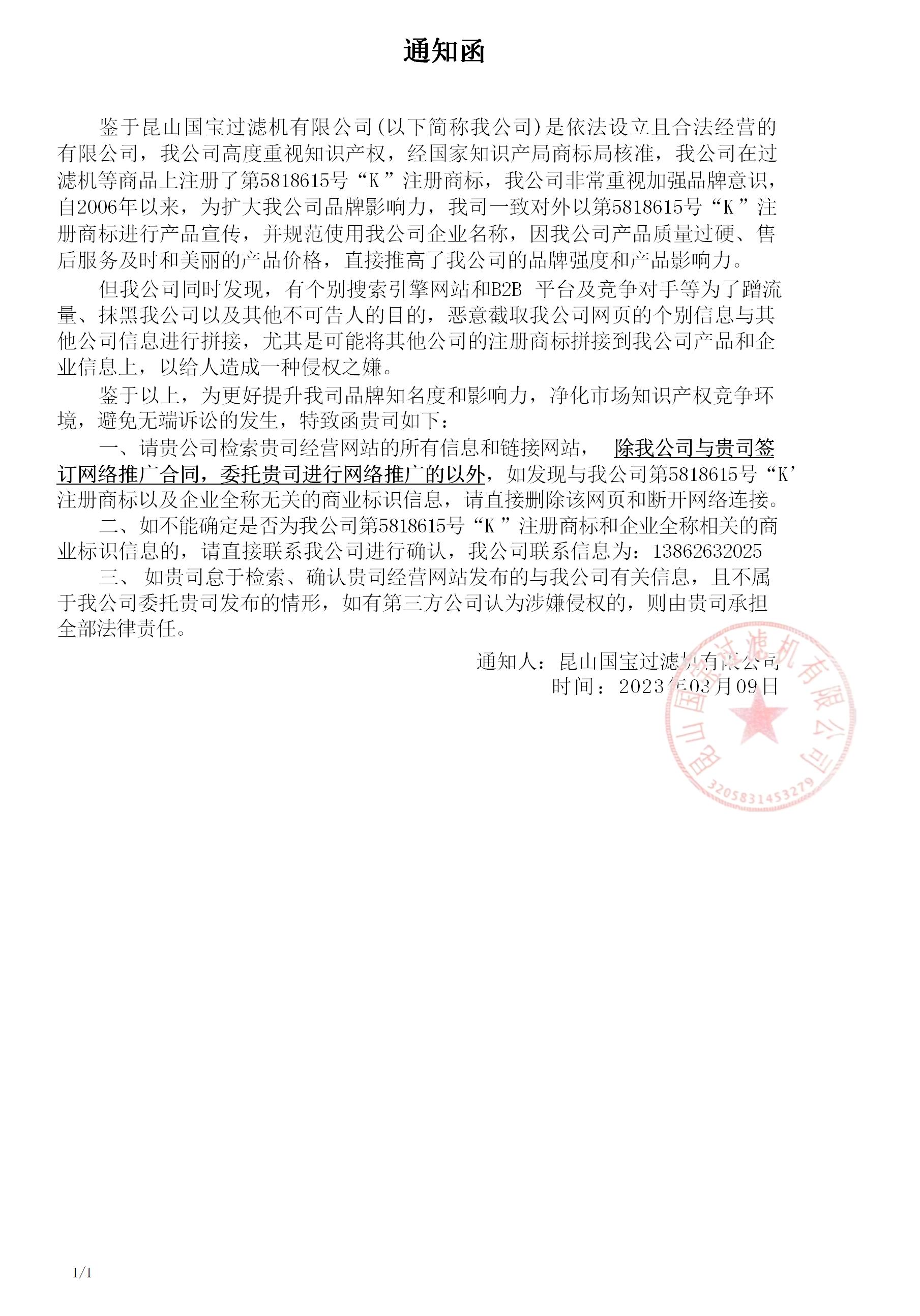鑒于昆山國寶過濾機有限公司(以下簡稱我公司)是依法設立且合法經(jīng)營的有限公司,我公司高度重視知識產(chǎn)權,經(jīng)國家知識產(chǎn)局商標局核準,我公司在過濾機等商品上注冊了第5818615號“K”注冊商標,我公司非常重視加強品牌意識,自2006年以來,為擴大我公司品牌影響力,我司一致對外以第5818615號“K”注冊商標進行產(chǎn)品宣傳,并規(guī)范使用我公司企業(yè)名稱,因我公司產(chǎn)品質量過硬、售后服務及時和美麗的產(chǎn)品價格,直接推高了我公司的品牌強度和產(chǎn)品影響力。